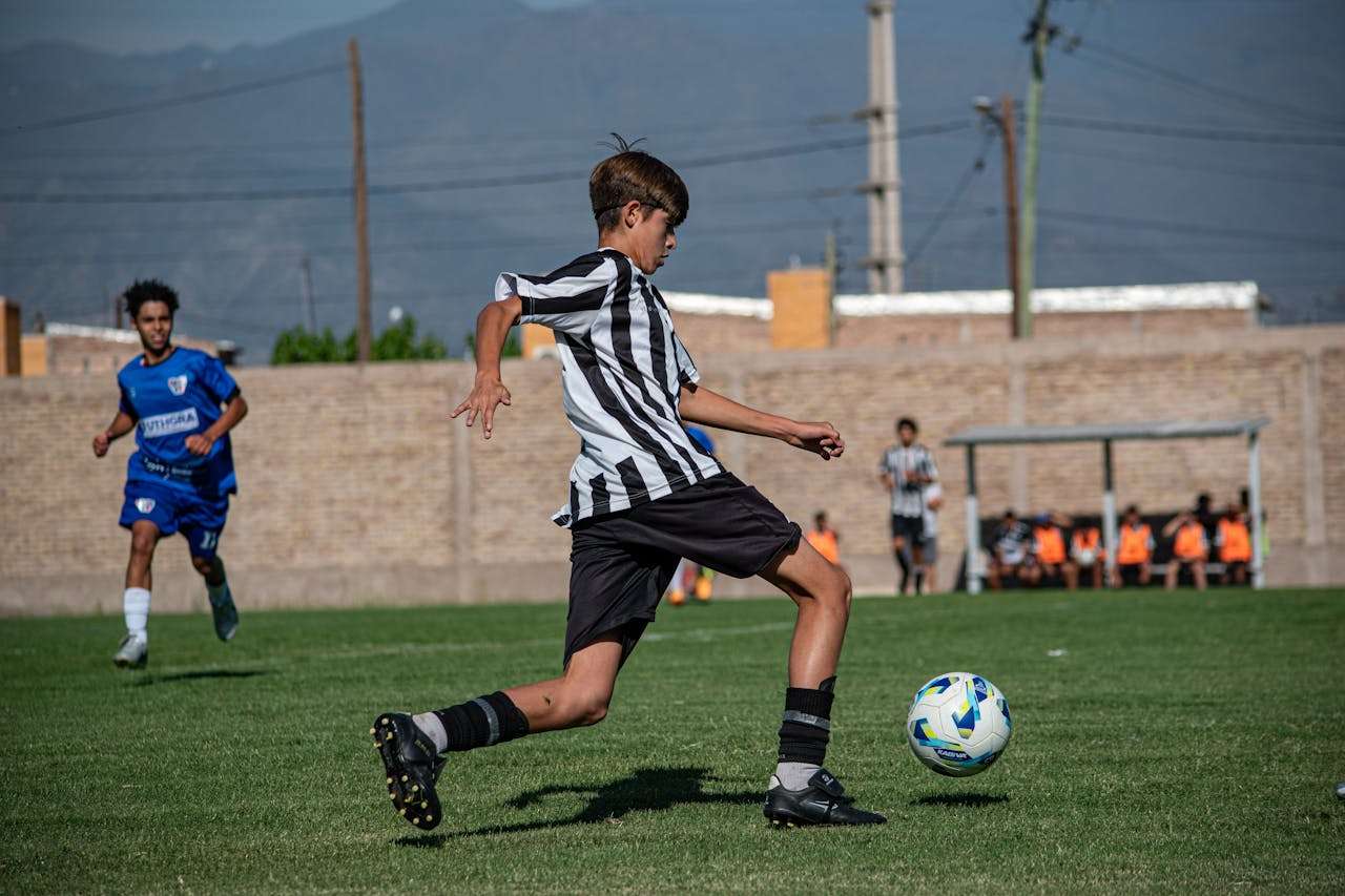 这位足球运动员的球衣带有醒目的条纹。
