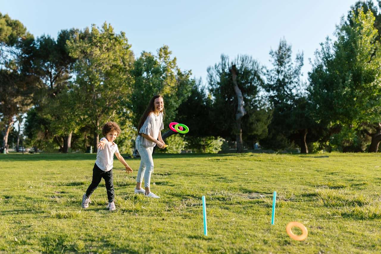 人们常在晴朗的日子到开阔场地练习扔飞盘。