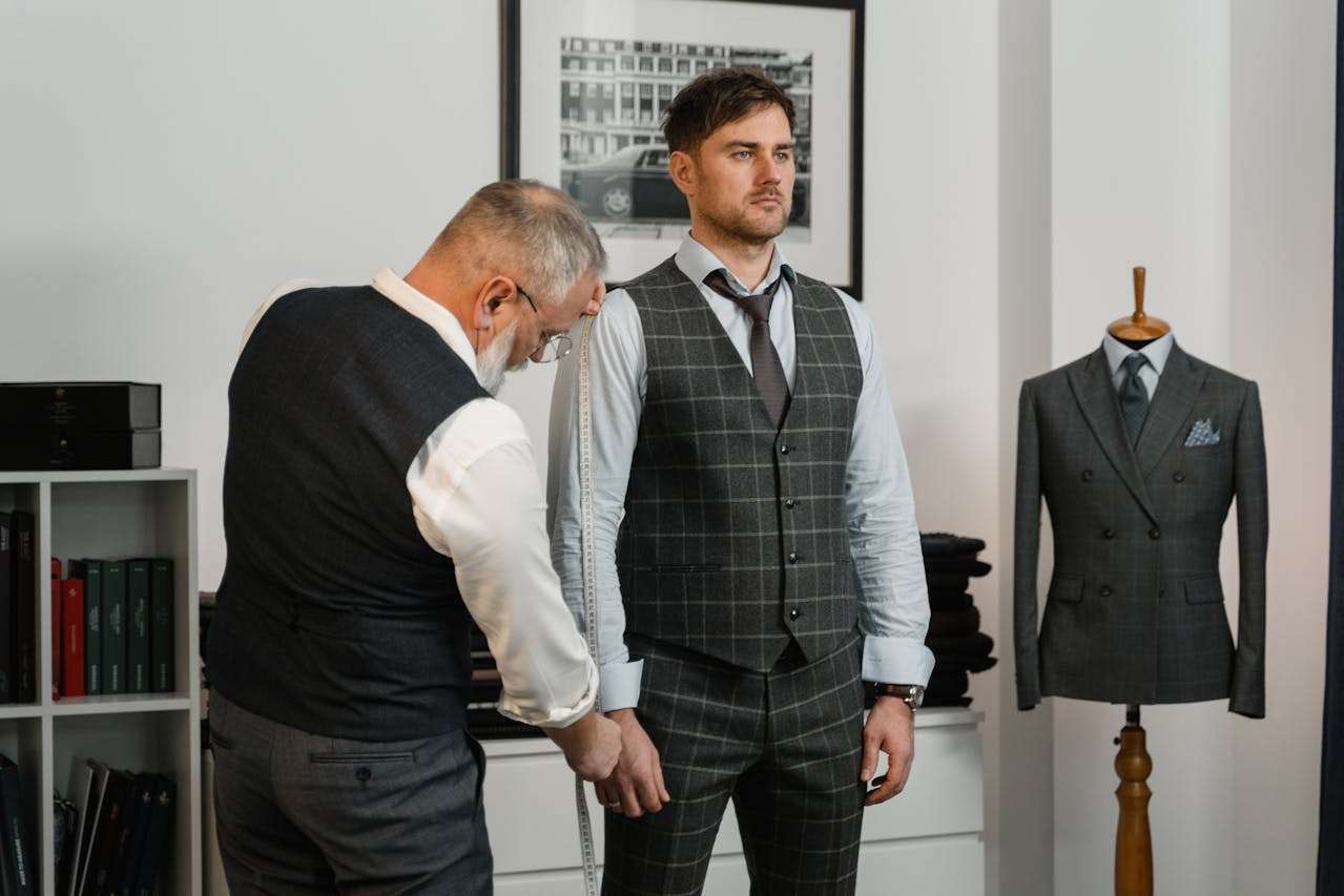 The tailor comes over and measures the sleeve with a soft tape.